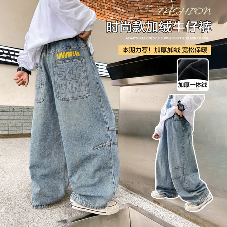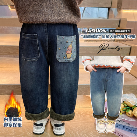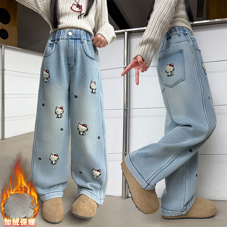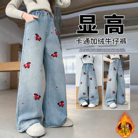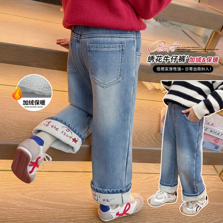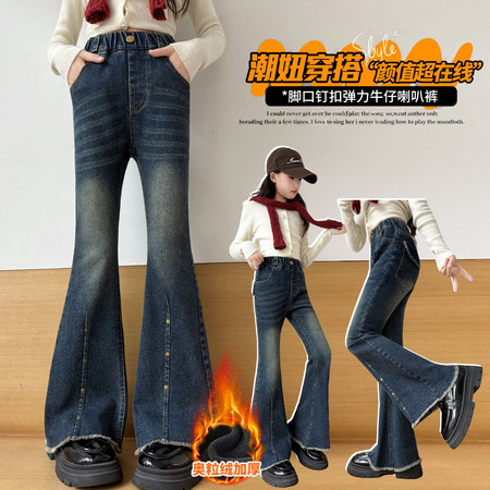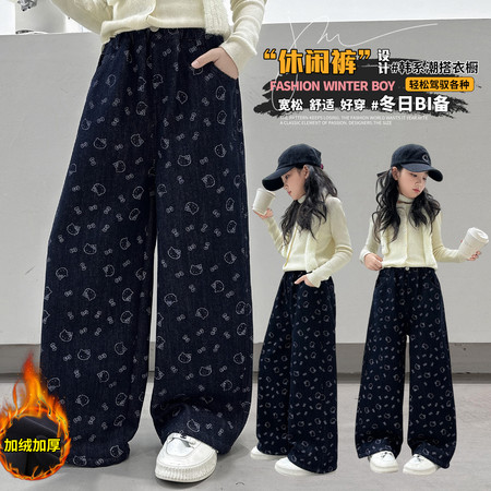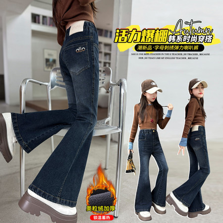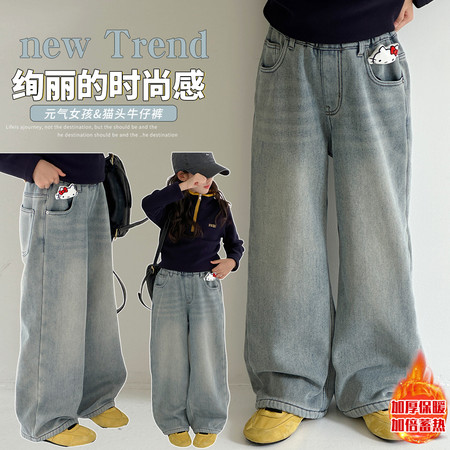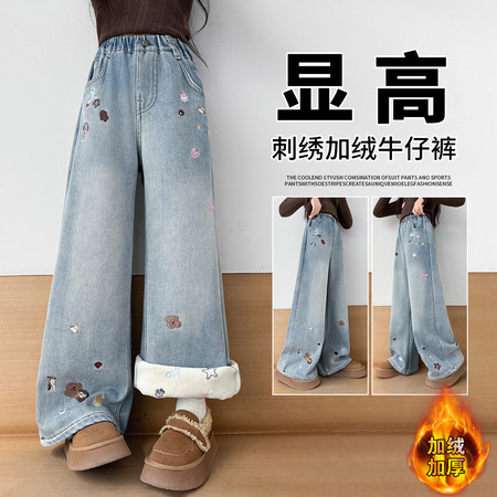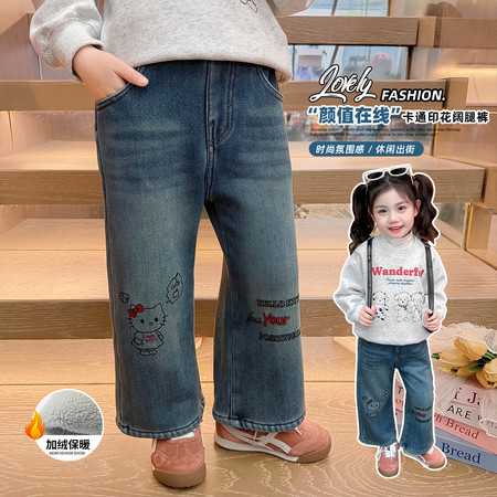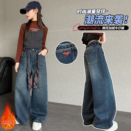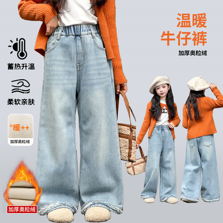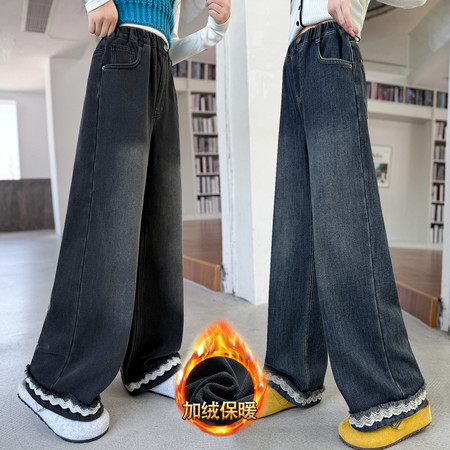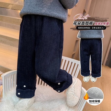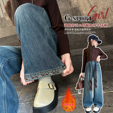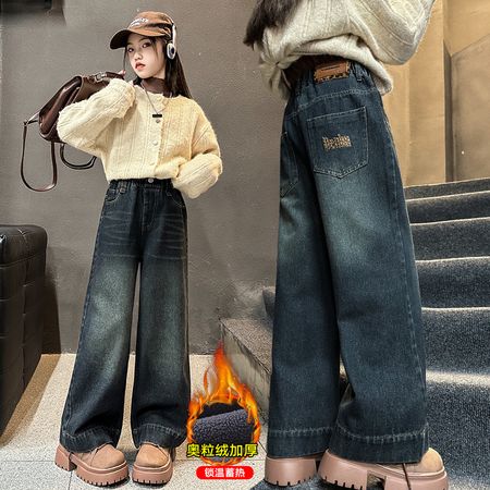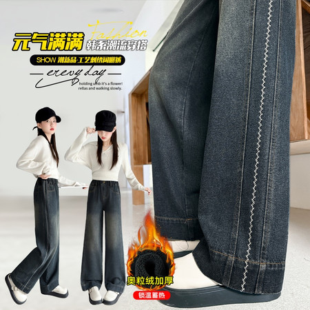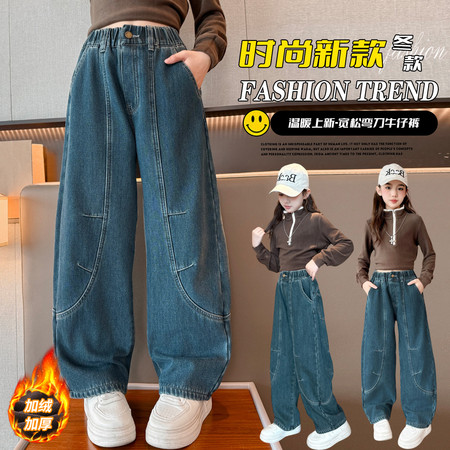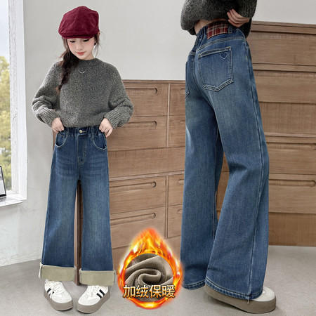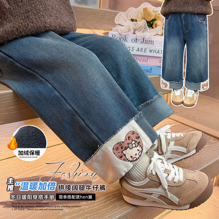 豪涵童装&女童冬款加绒拼接弯刀牛仔阔腿裤8871