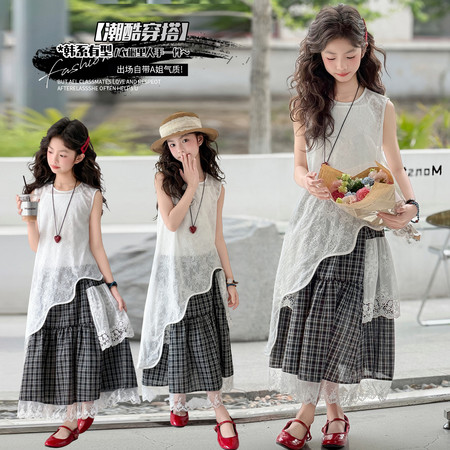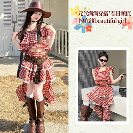 R223款格子网纱拼接半身裙套装
