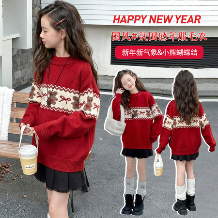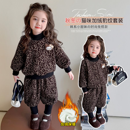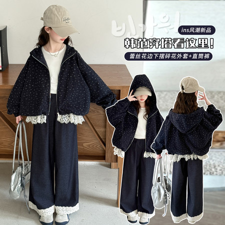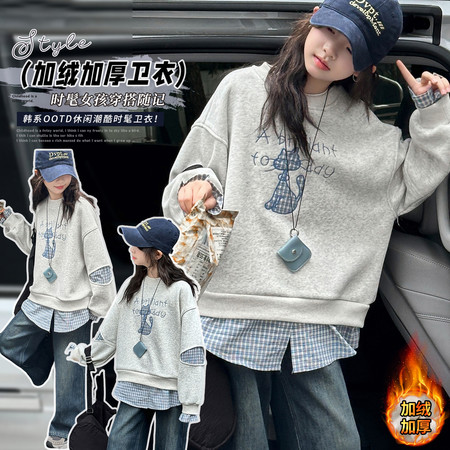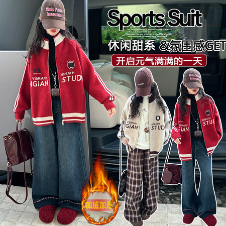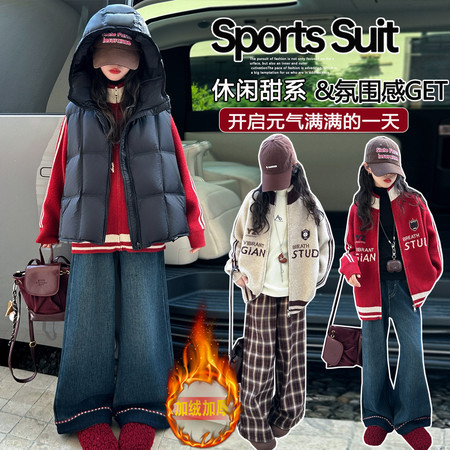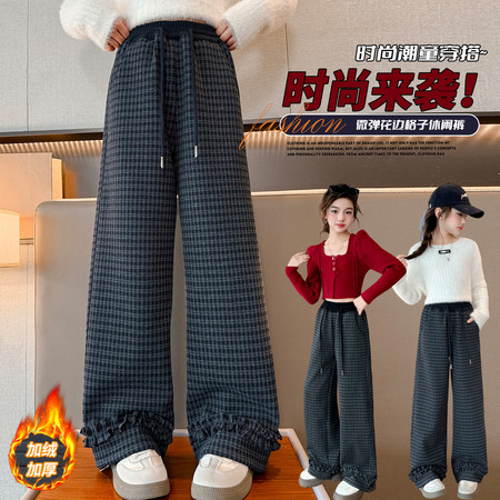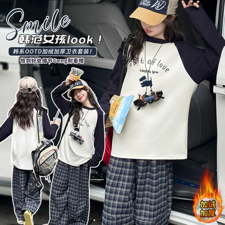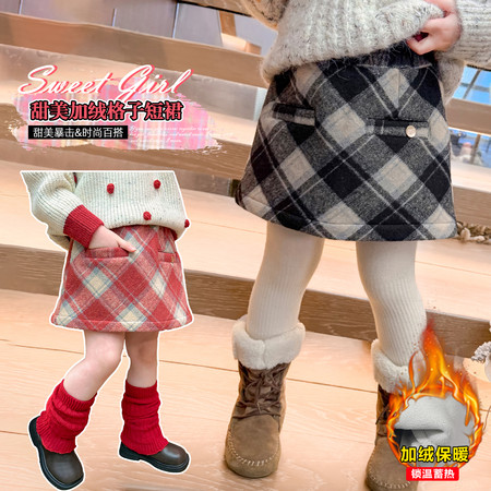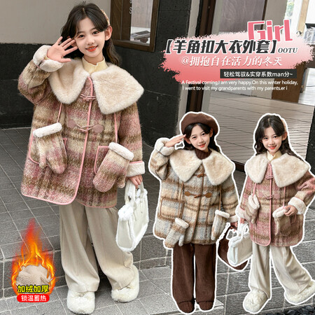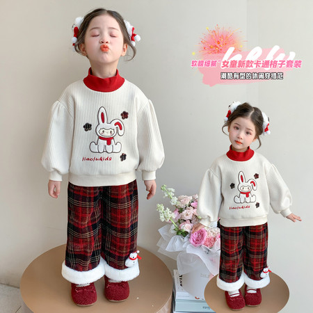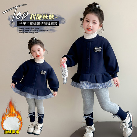 丫豆童装&花边毛毛衣加绒格子裤三件套