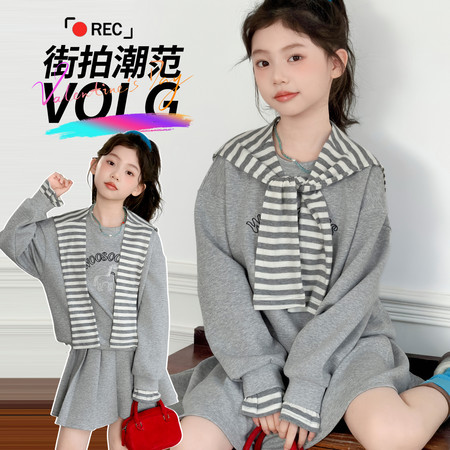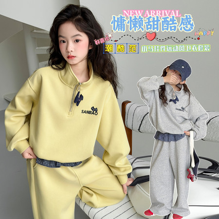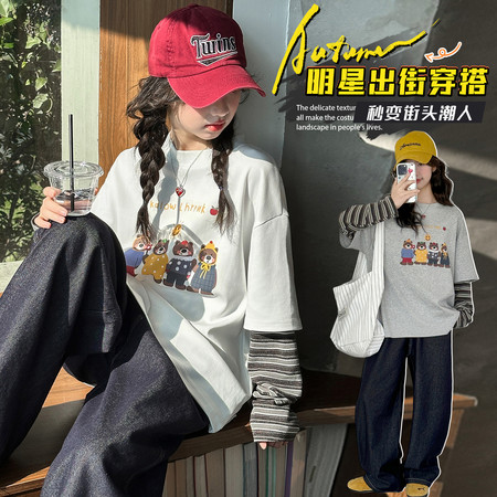 邻家果果&2602小熊假两件打底衫弯刀裤套装