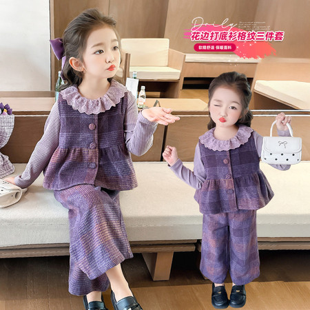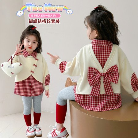 漂亮优贝童装&2919款格子衬衫T恤牛仔裤三件套