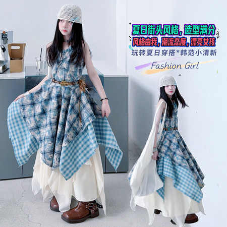 七色雨&2616无袖格子牛仔短裙套