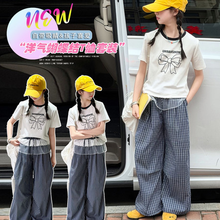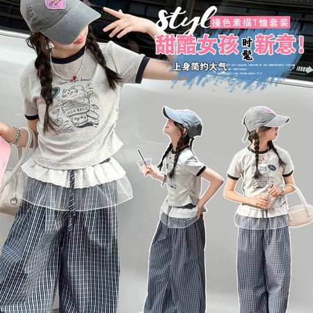 五小七&SJ8427牛仔格纹短袖三件套