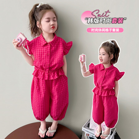 小豆町&D3250木耳边玫红格子套装