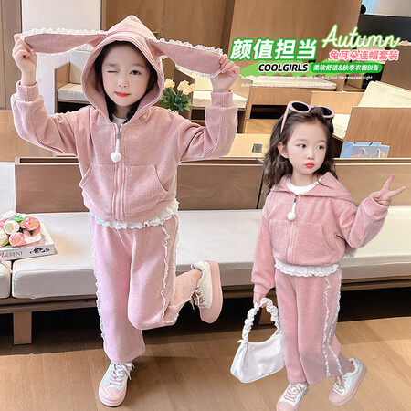 漂亮优贝童装&2922款坑条帽衫九分牛仔阔腿裤两件套