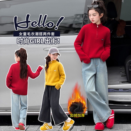 豪涵童装&女童冬款加绒拼接弯刀牛仔阔腿裤8871