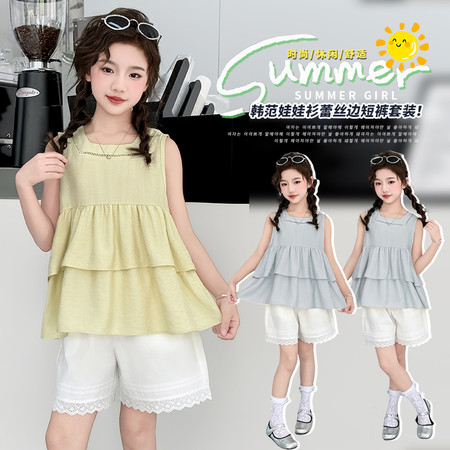 星星年华&DX04614方领无袖荷叶边衬衫白色短裤