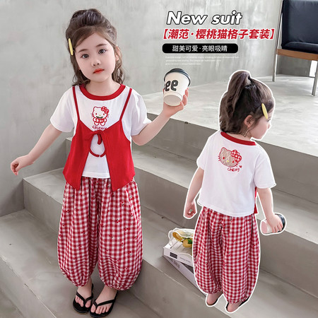 米咔精灵&66080KT格子花边下摆T恤休闲套装