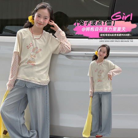 米咔精灵&66077清新小字母T恤牛仔裤套装休闲