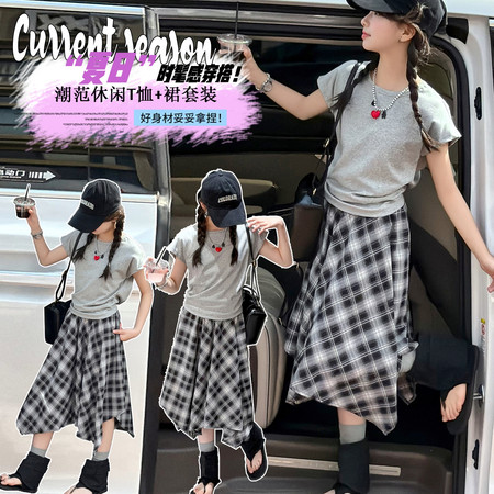 R223款格子网纱拼接半身裙套装